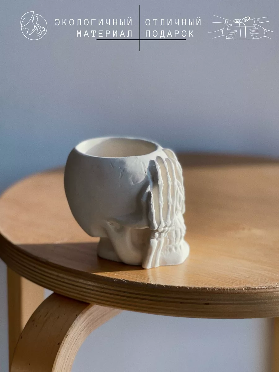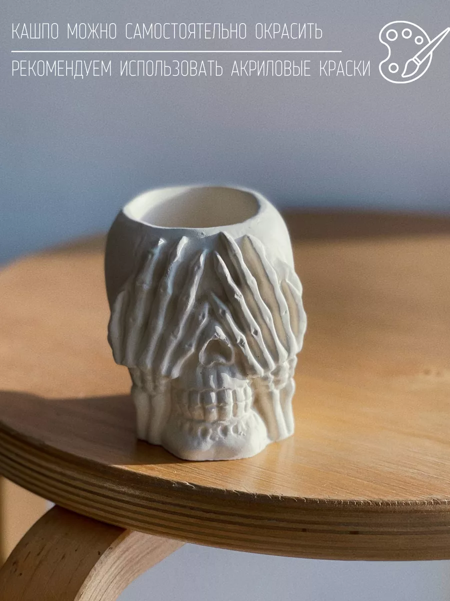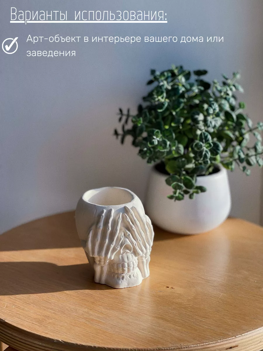 Кашпо из гипса Череп — это не просто декоративный элемент, но и функциональный предмет интерьера. Оно может использоваться как горшок для растений, подставка для цветов или органайзер.