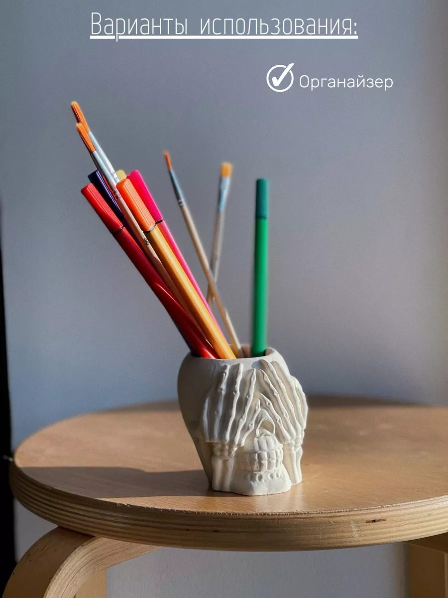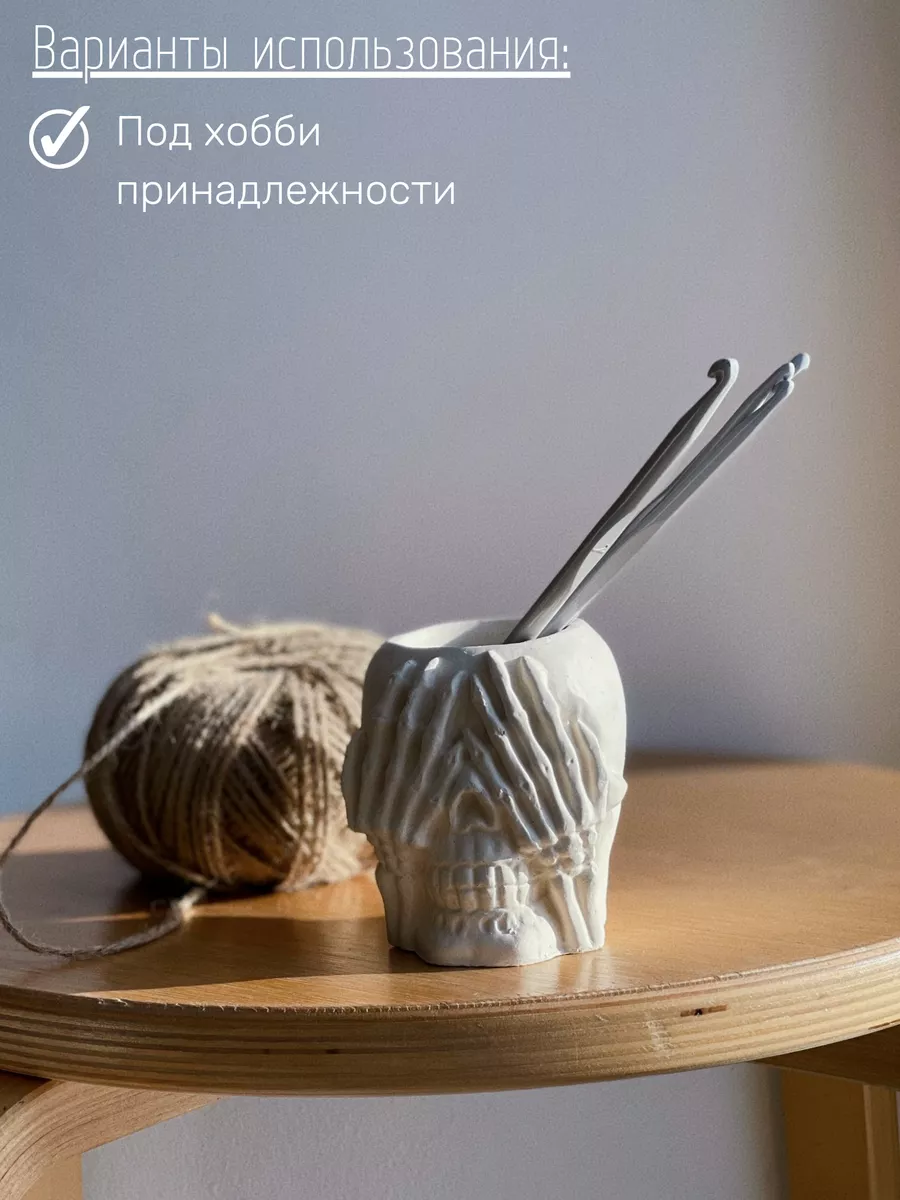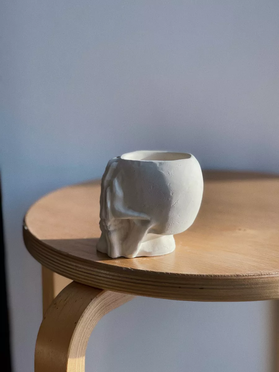 Кашпо из гипса Череп — это не просто декоративный элемент, но и функциональный предмет интерьера. Оно может использоваться как горшок для растений, подставка для цветов или органайзер.
